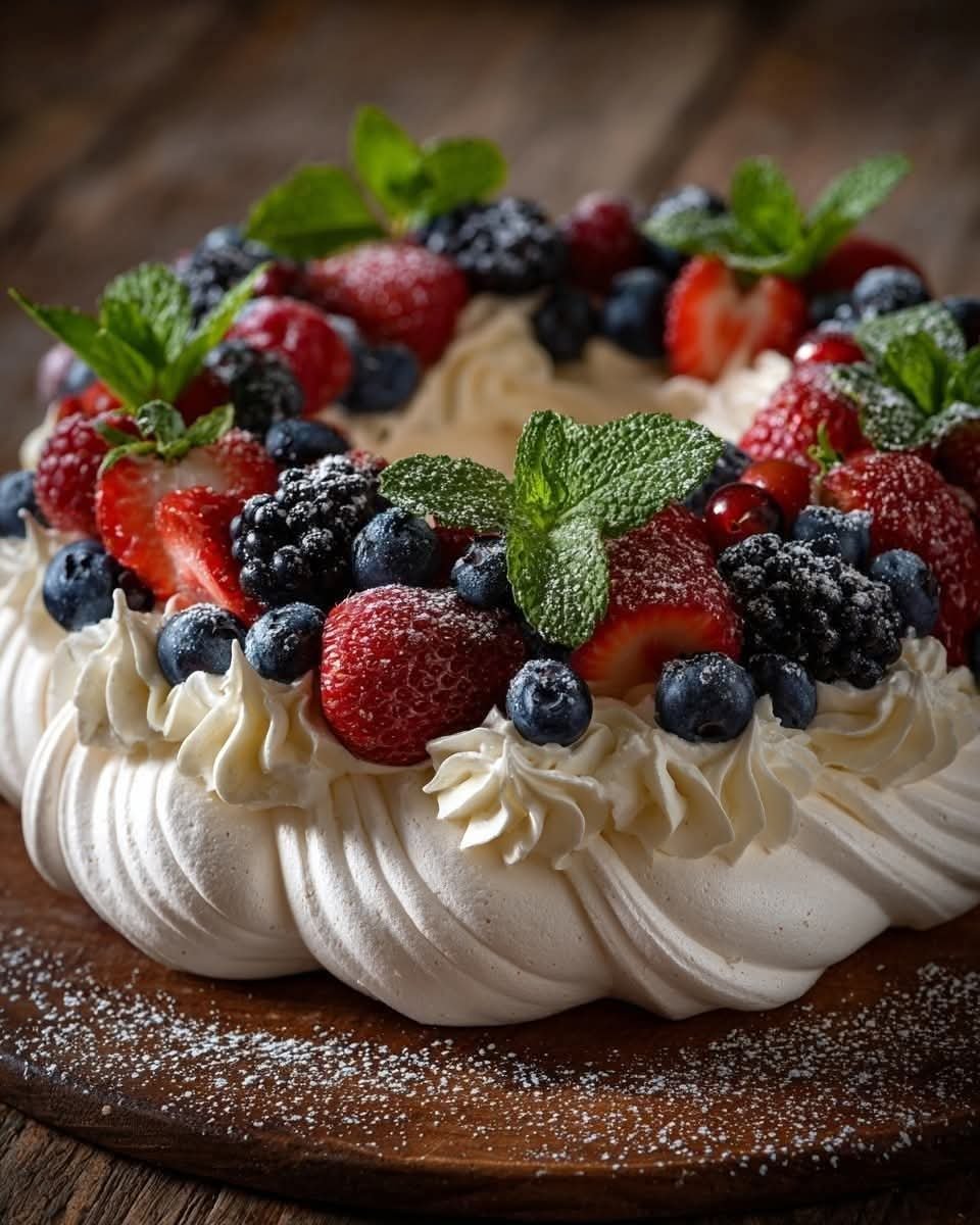 Place meringue wreaths on a serving plate. Pipe or spoon whipped cream into the center of each wreath. Top with fresh berries and optional mint leaves.