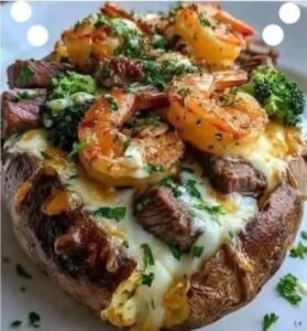 Loaded Steak and Shrimp Baked Potato π¦ Dive into a mouthwatering masterpiece that combines juicy steak, succulent shrimp, and cheesy goodness all atop a perfectly baked potato!