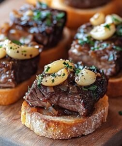 Tender Braised Short Ribs Served with Crispy Garlic Crostini